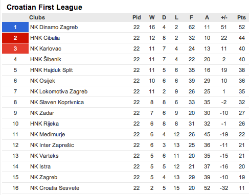 with the Croatian league i'm more interested by the relegation zone than the top. I think Cibalia look good for second. Hajduk have their work cut out for third with Lokomotiva and Karlovac still winning and I expect Osijek and Sibenik to have another spurt. Hajduk need to pick off the likes of Varteks, Sesvete, Zapresic, Medimurje to get their points as not every ground will be easy for them.