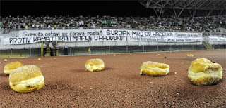 If a picture is worth 1,000 words, then this one is worth 100,000. Not only are Torcida wasting perfectly good krafne on Hajduk but they’re obviously not big fans of club chairman Joško Svaguša and Ivica Šurjak either.