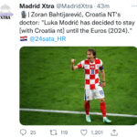 By 8 CommentsMadrid Xtra, a highly reliable source with 400,000 followers on Twitter, have reported that Luka Modrić will stay on with Croatia until EURO 2024! This is coming via Croatian team doctor Zoran Bahtijarević, who is back with the national team in Zagreb this week. This wouldn't at all surprise me with Modrić playing some of the best ball of his life in his mid-30s. If Modrić … [Read more...] about BREAKING NEWS: Modrić To Stay On As Croatian Captain Through EURO 2024