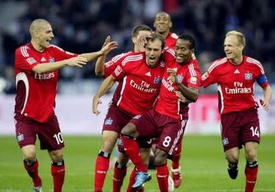 Photo: bundesliga.de, Mladen Petrić, left, celebrating with Hamburg teammates