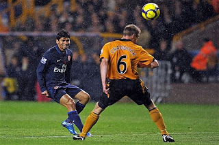 Eduardo got a well-deserved start in place of injured striker Nicklas Bendtner Saturday afternoon and made the most of it in front of 29,000 at the Molineux Stadium as Arsenal made the trip to Wolverhampton. The first 20 minutes of the match looked bleak for the Gunners as Wolverhampton applied heavy pressure on a rain soaked night. It wasn’t until the 28′ when Eduardo forced a smart foul in the corner to give Arsenal a good look at goal. The following play resulted in a corner, which at first looked to be scored by Dudu, but on replay clearly shows going off Wolverhampton defender Ronald Zubar for the own goal. Eduardo refused to celebrate.